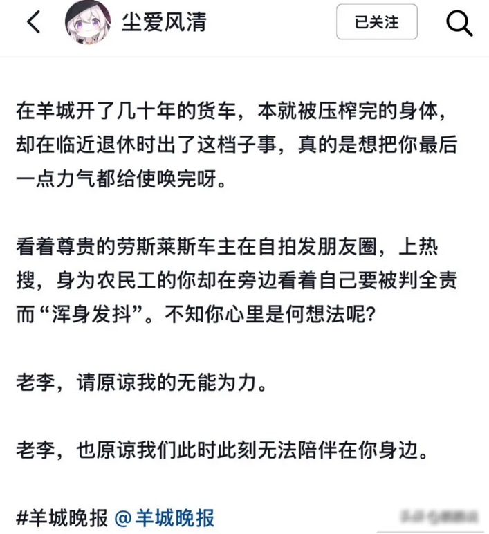 最初,这场交通事故的新闻并不算特殊。广州一位长期奔波的货车司机老李与一辆价值不菲的劳斯莱斯发生碰撞,事故原因也并不复杂。交警判定老李全责,由于劳斯莱斯的维修费用预估超过百万,老李面临着巨大的赔偿压力。