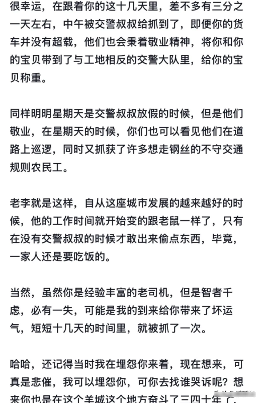 小李首先提到父亲在广州的辛劳,称自己曾在假期跟随父亲体验货车驾驶,三天后便因疲惫不堪而放弃了。然而,父亲却在这种高压的工作环境中坚持了数十年,小李感叹父亲的坚忍,却也在文中含蓄地表达了对交通执法的“不满”。