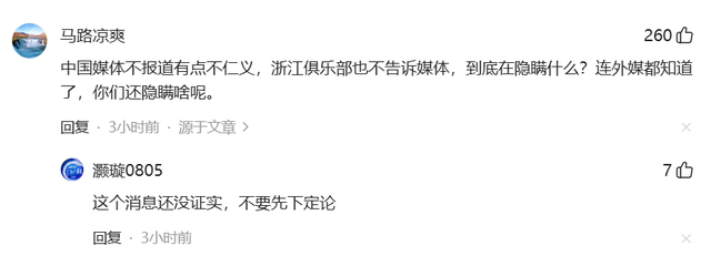 看看网友怎么说!中国媒体不报道有点不仁义,浙江俱乐部也不告诉媒体,到底在隐瞒什么?连外媒都知道了,你们还隐瞒啥呢。
