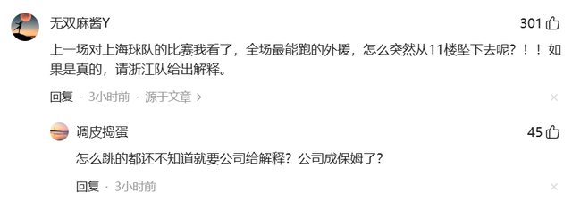 上一场对上海球队的比赛我看了,全场最能跑的外援,怎么突然从11楼坠下去呢?!!如果是真的,请浙江队给出解释。