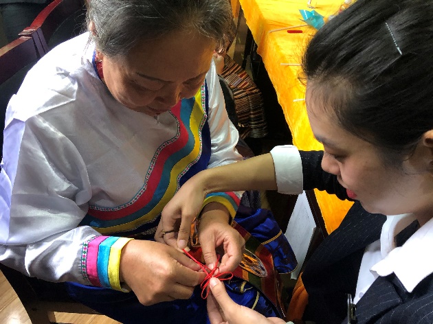 有趣好玩的游戏结束之后,编绳培训活动正式开始。此次讲课的编绳老师是老凤祥的邓老师,她带来了自己编织的工艺品,让大家欣赏,并向居民们讲述了手工编绳所用的材料和几种绳结的编法。在老师的指导下,居民们很快就学会了编绳技巧,认真编织属于自己的手工绳艺制品,感受编绳艺术变幻莫测的非凡魅力。