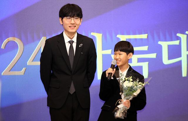 申真谞与未来之星奖崔海权合影。崔海权小小年纪表露雄心:“申真谞老师是公认的世界第一,是守护韩国围棋自尊心的人,我很尊敬他,也很想战胜他。希望能在七年之内与申真谞老师在比赛中交手,我要更加努力,争取五年内实现这一目标。”