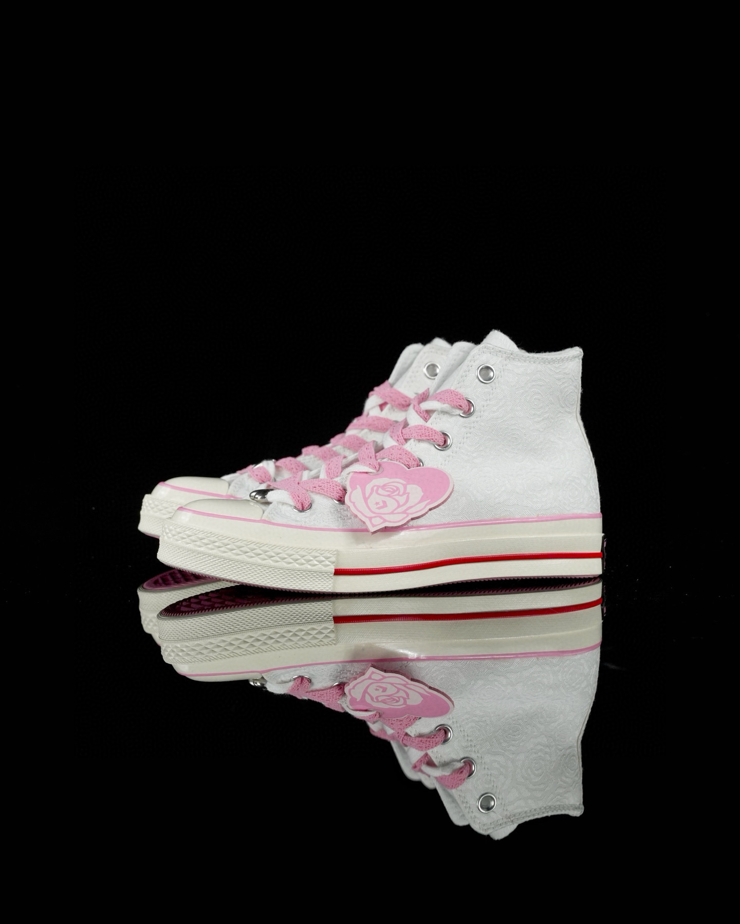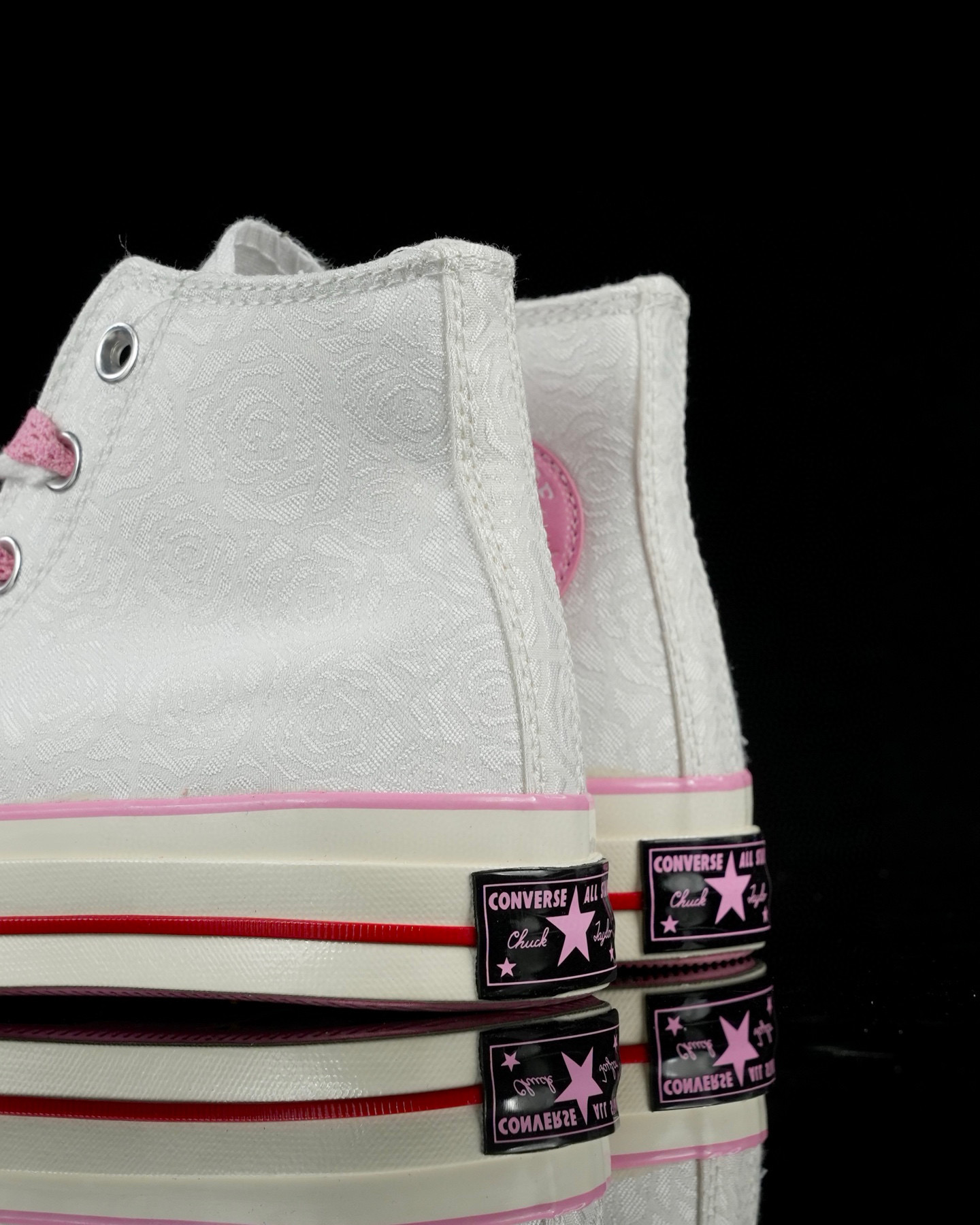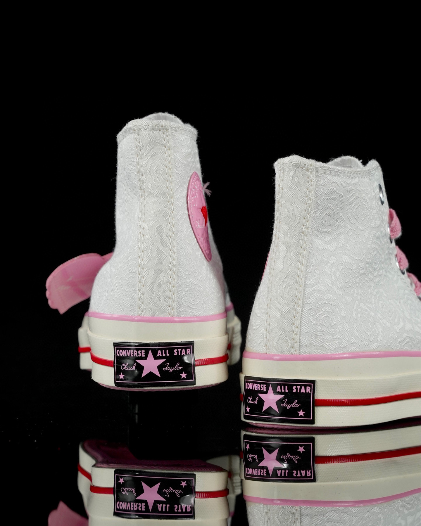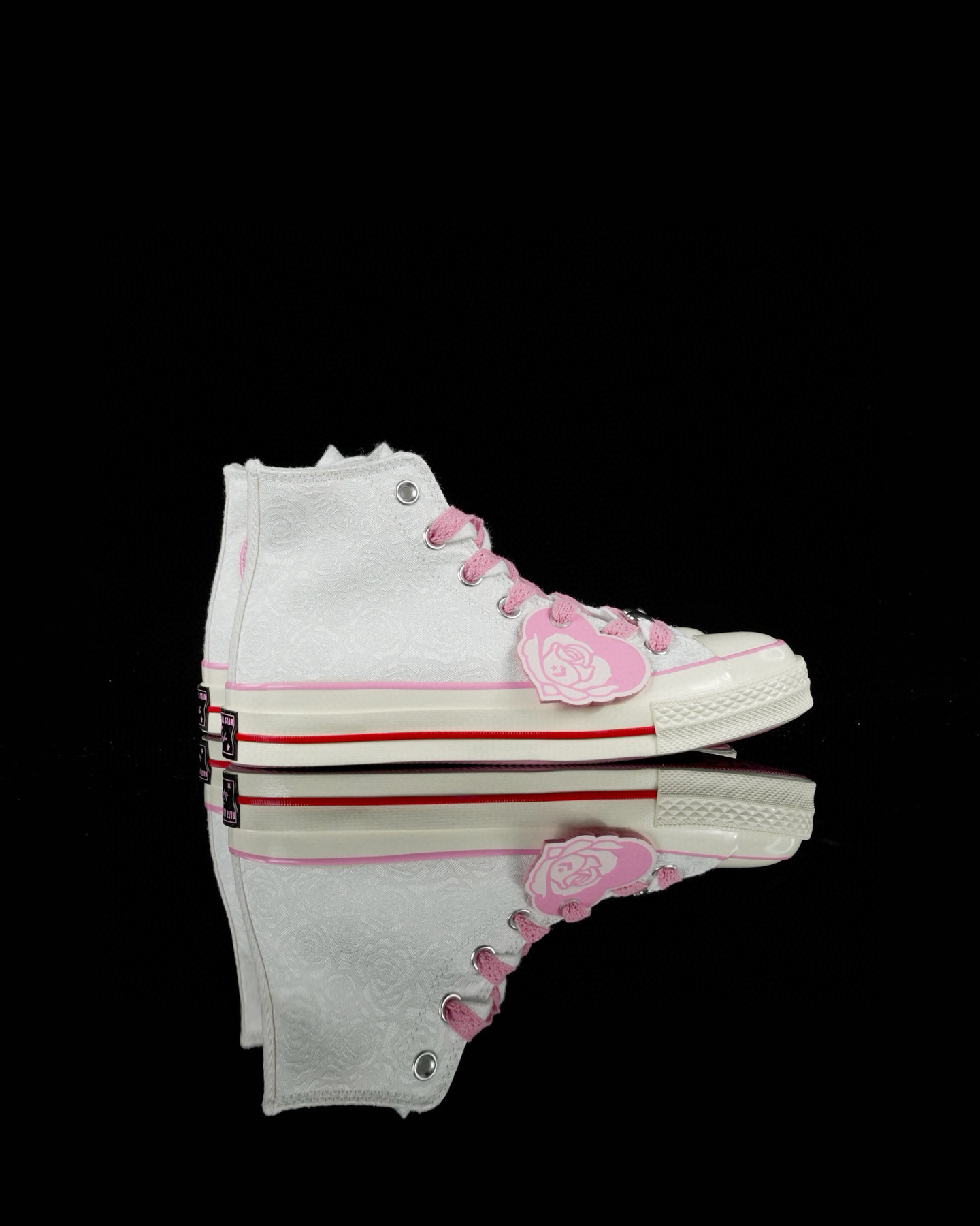 匡威官方新款 鞋面采用玫瑰花刺绣提花纹理 暗藏浪漫摩斯密码 爱心红底步步生情,附赠粉红蕾丝鞋带系住桃花运 经典高帮版型配牛仔甜辣 搭纱裙仙气拉满 OrthoLite鞋垫走路自带粉红泡泡 立体心形粉红玫瑰挂牌 细节满满。