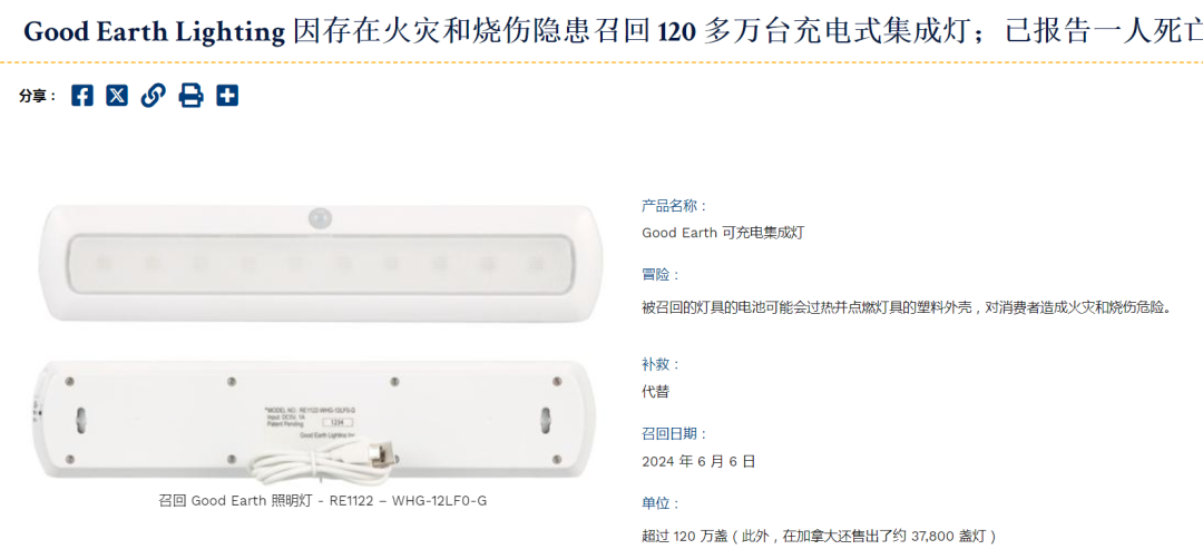 需要注意的是,安全警钟已经一次又一次被敲响,在美国消费品安全委员会(CPSC)的官网上,我们可以看到诸多被召回的商品。举个例子,在2024年6月6日,CPSC发布公告称要召回一批存在火灾和烧伤安全隐患的照明灯。通知指出,这些照明灯的锂电池可能过热,进而点燃塑料外壳,从而引发火灾。