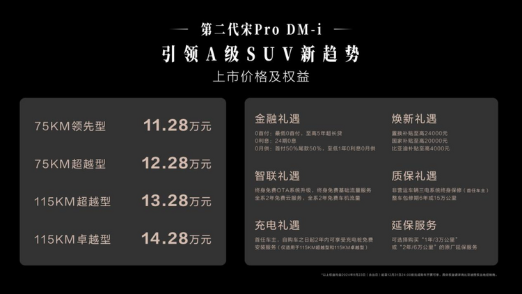 同时,新车还享受0首付、24期0息、置换补贴、国家补贴、非营运车辆三电终身质保、终身免费基础流量、首任车主2年内免费安装充电桩等服务。