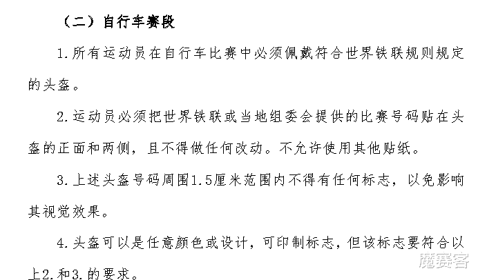 比如,骑行阶段里,该项目对自行车是有要求的,头盔也是自行车项目的装备之一。在中铁协的规则里,不少是参考世界铁联的。