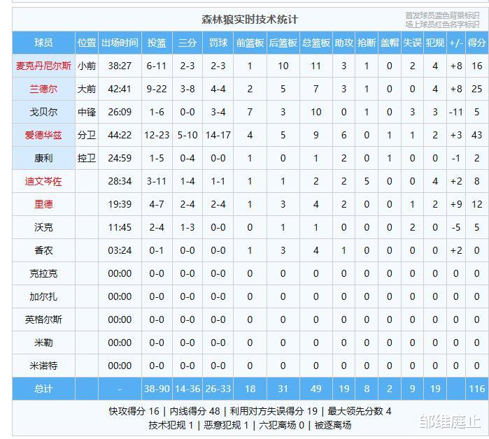 湖人痛失好局,最后领先的情况下,连续犯错,客场113-116不敌森林狼,大比分1-3落后,再输一场就回家钓鱼。这场比赛很有意思,你方唱罢我登场,双方轮流表现,第一节湖人领先,第二节森林狼反超,第三节湖人再反超,第四节森林狼完成逆转。可以看出双方的实力是非常接近的,胜负就在好毫厘之差,关键时刻还是看球星啊。本场数据如下图: