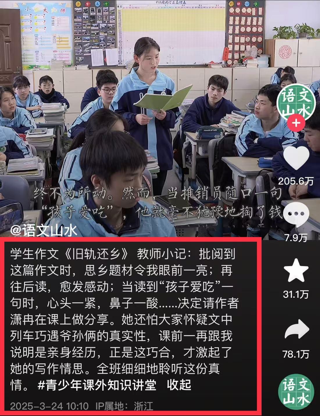 张萧冉就会想起自己每次和姥姥姥爷儿时回家情景,用这篇纪实文交啦寒假作业,文字内容细腻,感情真挚,言语温馨,语文老师批阅时都感动的泪眼模糊,把文字通过张萧冉当全班同学朗读式分享学习,用视频呈现出来,立马冲上热榜,被(央视、人民日报、新华社)转发,点赞破百万,阅读过亿,感动全国网友,网友说这篇作文就是朱自清背影一样文笔优美,阅读这篇作文更像是看了一场电影。