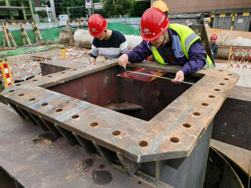 如何在如此“极限”的条件下进行施工而不影响周边环境,成了18号线三期工程面临的第二大难题,解决这个难题的关键,便在于精细地“拿捏”力道。以车站建设为例,需要先将多根60余米长的矩形钢管柱插入地下,然后通过自主研发施工装置,使这些接近20层楼高的柱子在插入地下时,垂直精度能控制在千分之0.5以内。这种施工装置被鉴定为国内领先,并申请发明专利1项、实用型新型专利2项。18号线三期还采取了“一边挖一边盖”的方式,基坑深挖一层,就做一层车站结构,减少对周边环境的影响。