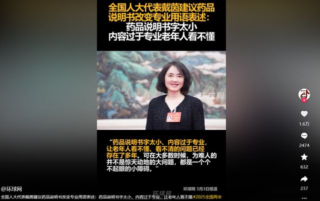 全国人大代表戴茵,连续三年建言“药品说明书”改大字号、改变专业用语表述.2025-03-02 22:21·红星新闻