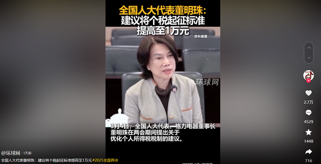 董明珠:建议将个税起征标准提高至1万元.2025-03-04 22:53·证券时报