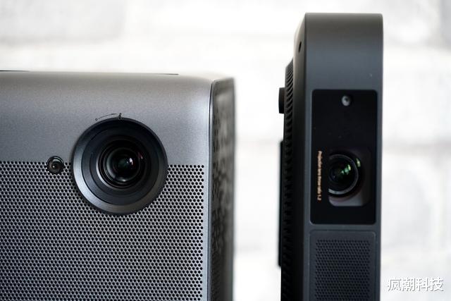 镜头配置,这两款智能投影仪在镜头方面都选用的是玻璃+树脂的配置方案,这个方案的优势就是在于照射效果通透、长期使用也不易跑焦,这个我在之前的同类产品评测中提及过,在这里我就不和大家赘述了。