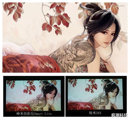 还是说回画质表现吧,第一组对比找先不给大家看原图,我们就看这两张投射画面表现,我觉得单从这组对比照片来看,拥有四通道LED RGB+BP技术加持的两台投影在色彩还原方面做的还不错,不过我也有一个问题不禁想问,峰米投影仪Smart Lite是700ANSI真实亮度,那么极米Z6X是多少ANSI真实亮度呢?从照片来看好像没什么区别吧。