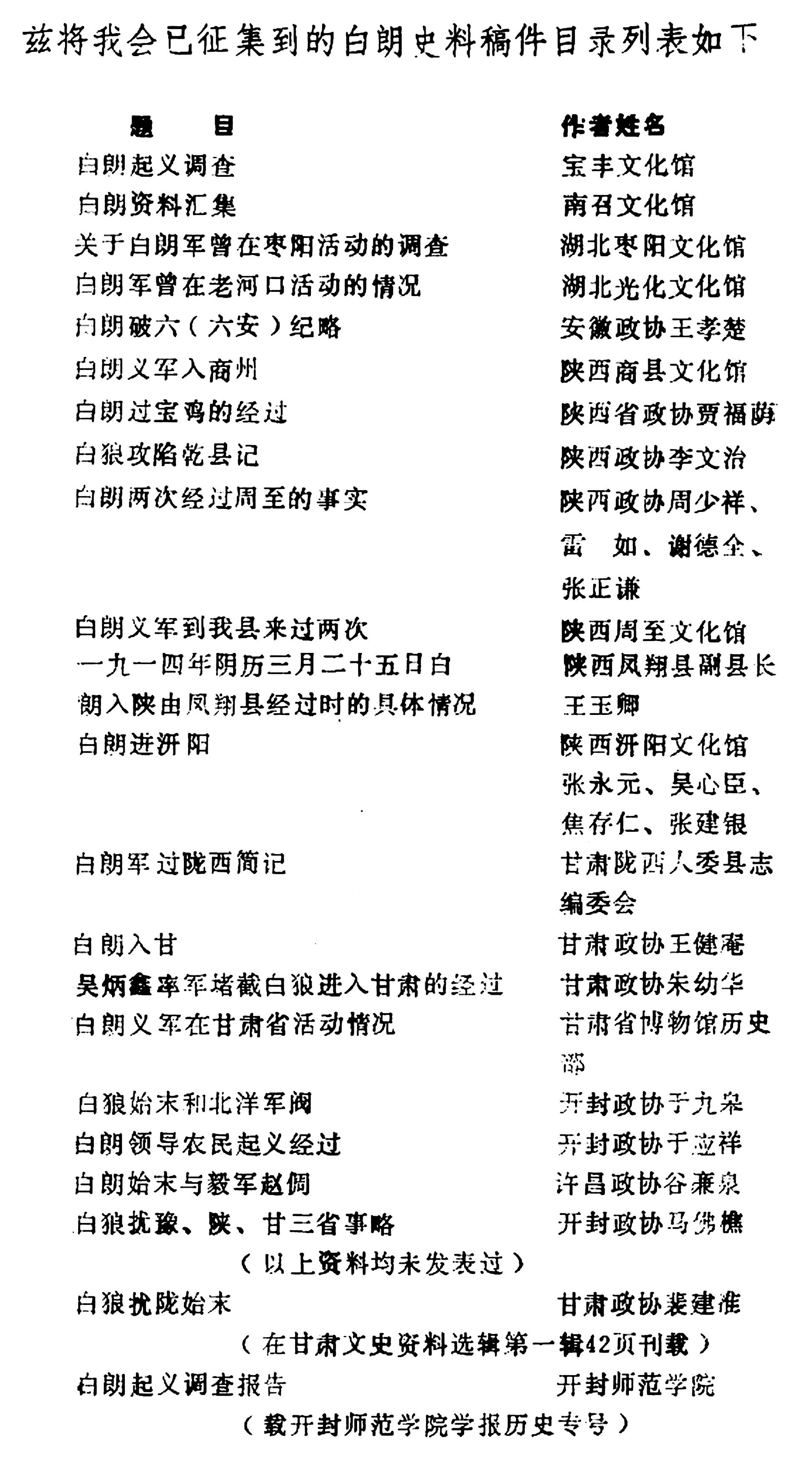 2、白朗军称谓问题。白朗在安徽六安自称“建国讨贼第二军”,西进陕甘后改称“公民讨戴军”。各地稿件中对白朗的称谓颇不一致。有称起义部队,有称白朗部队,白朗义军,白朗部,白军的,也有称白狼、白匪、狼军的。如裴建准、朱幼华、于九皋、马佛樵、贾福药、李文治等称白狼,王健庵称白匪,周少祥称白朗。为便阅读,概作白朗。