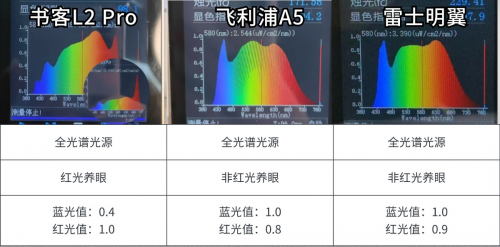 从本次测试和官方资料得知,上述三款护眼台灯均为全光谱光源,其中书客护眼台灯L2 Pro有专业红光养护眼技术,而飞利浦A5和雷士明翼护眼台灯则无红光养护眼技术。这两款护眼台灯都具有同样的光谱不连续和对有害蓝光处理较弱的问题,这样的护眼台灯在护眼实力上相对逊色,当一盏护眼台灯的光谱结构不连续,眼睛可能需要更加努力地去适应环境中的光线变化,从而可能导致更快的视觉疲劳和不适感。