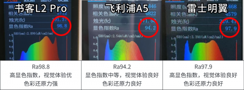 从本次测试数据来看,三款护眼台灯均与宣传的显色指数差异不大且达到Ra90,符合日常生活和学习灯光需求的基本显色指数值。其中达到Ra98以上的护眼台灯仅有书客护眼台灯L2 Pro,书客L2 Pro的显色指数高达Ra98.8,几乎逼近完美的Ra100标准,这意味着它能够极其精准地还原物体的真实色彩,提供极为接近自然光的照明体验。如此卓越的色彩还原能力,不仅有助于保护眼睛健康,最大限度地减少长时间用眼带来的疲劳,更是为那些对视力保护有严格要求的儿童、青少年以及需要长时间在台灯下工作的专业人士提供了理想的选择。