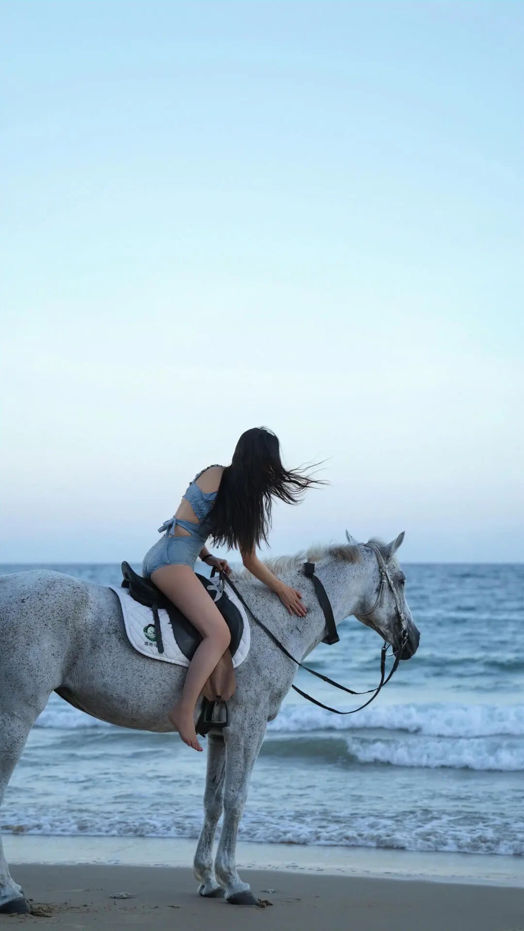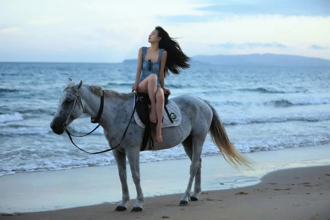 骑在马上的李梦,眼神坚定自信,望向远方海平面,似在探寻无尽的未知。骏马在她驾驭下,迈着优雅有力的步伐,在沙滩留下串串蹄印,与海浪声交织成勇敢者的乐章。