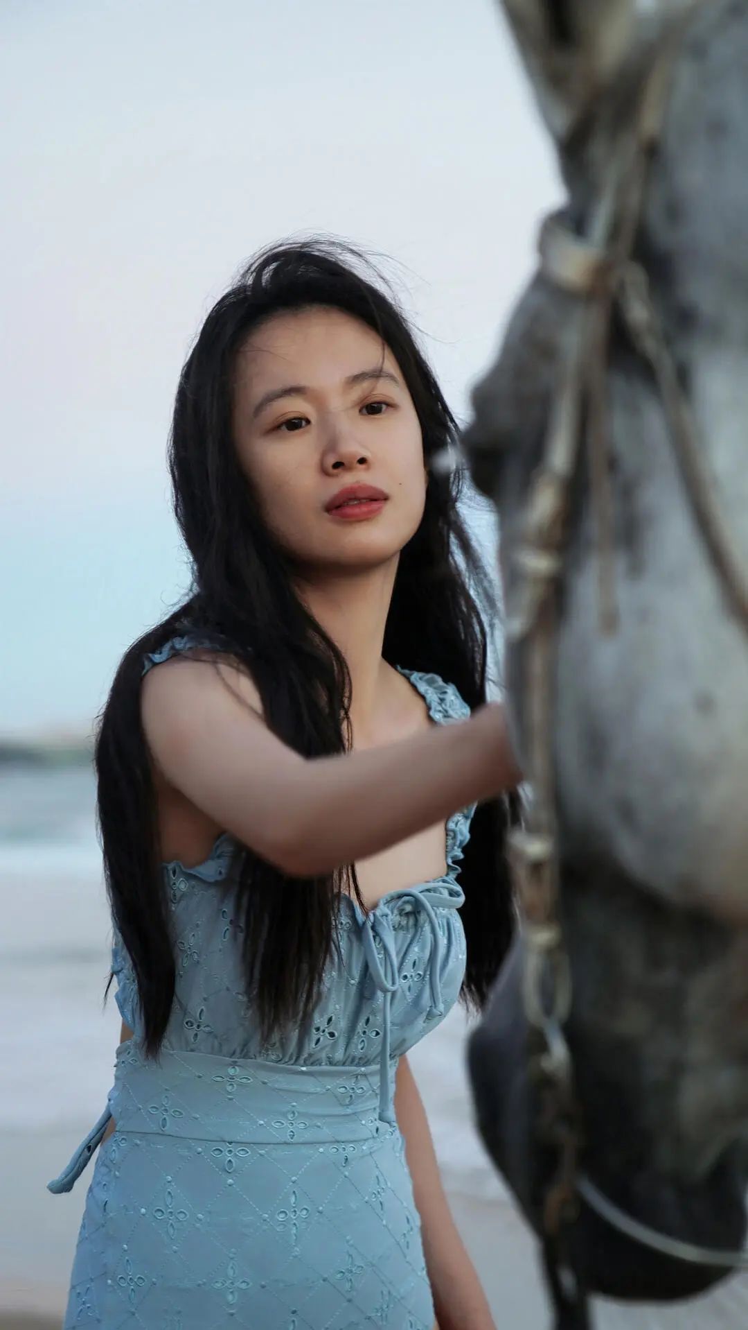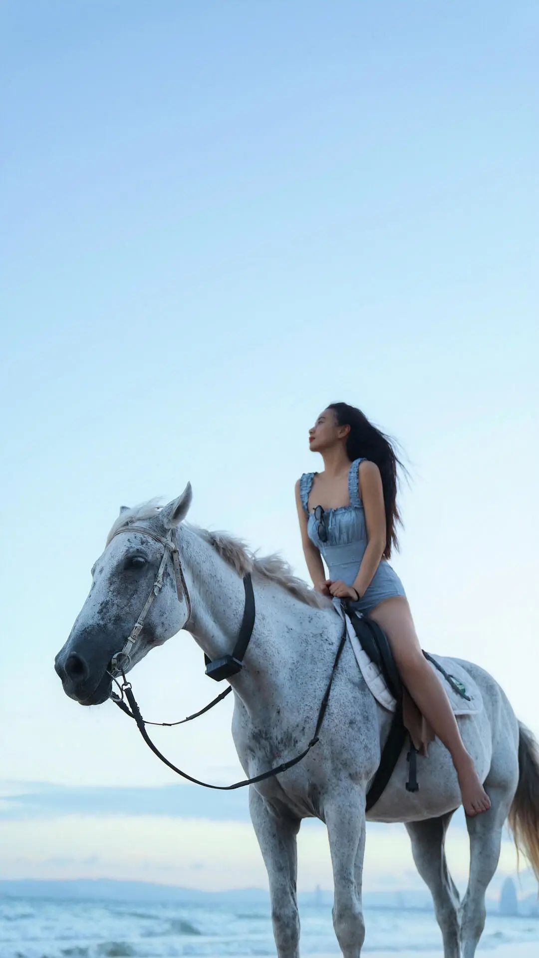 浩渺无垠的海边,海浪拍打着沙滩,涌起层层白色浪花。李梦犹如从梦幻中走出的精灵,跨坐在高大的骏马之上,构成一道绝美风景线。