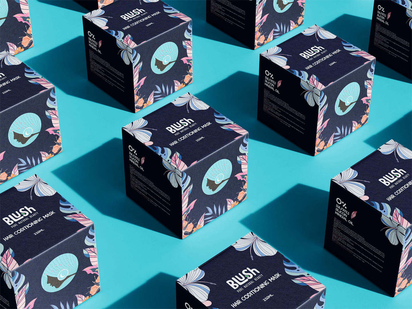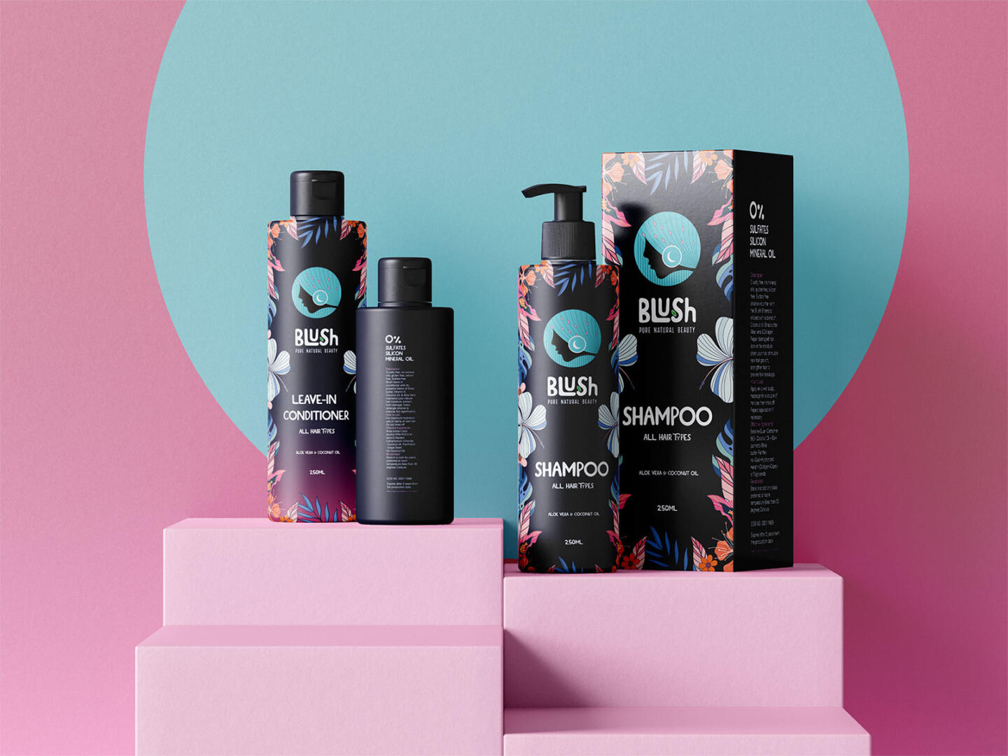 Blush是一个纯素的100%天然美容和护肤品牌,所有的产品都使用可持续的能源来源,并且对环境友好,其目标是为所有类型的头发和皮肤提供卓越的产品。包装设计注重自然元素和色彩的搭配使用,突出产品的天然和健康属性。以黑色为底色,装饰有丰富的花卉和叶子图案,对比下更加凸显鲜明活泼、时尚有活力。