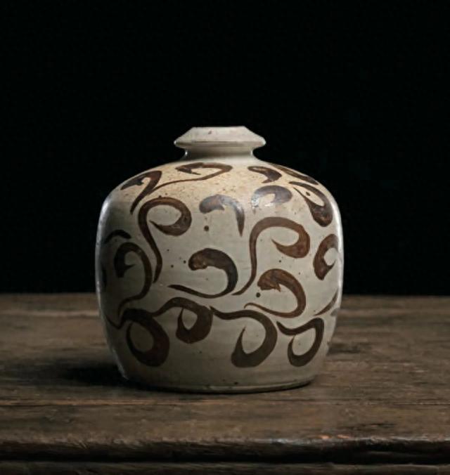 初看之时,卷草纹略显随意,待细看就能感受布局中的美学设计,横向舒展延伸,纵向也有向上攀升之势,似有莽莽草原青草怒放的生机盎然,也似有青青湖水中水草摇曳的悠然自得。白色釉面与褐色纹饰形成对比,所绘的卷草纹带有少数民族自由洒脱的翩然,别具韵味。
