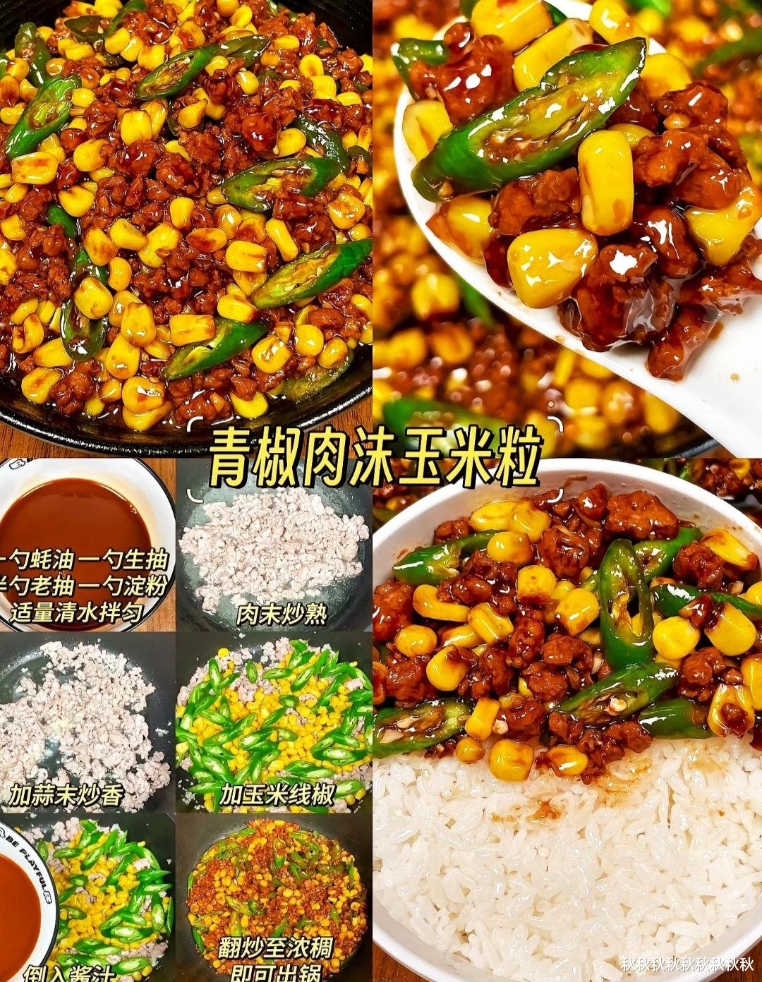 最后将做好的青椒肉沫玉米粒盛在白米饭上,一道美味可口的家常菜就完成了。