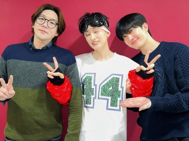 8日,周觅在社交账号上传了三人合照。照片中银赫站在中间,强仁以中分发型戴着眼镜出现,牛仔衬衫搭配条纹针织衫,周觅穿着蓝色毛衣和牛仔裤,也同样十分日常。