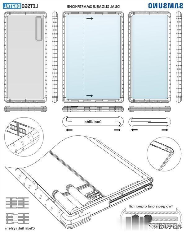 当时的文件显示,三星给卷轴屏手机外壳配备了两个齿轮及一个齿轮导轨,用于屏幕向外延展或收回屏幕。