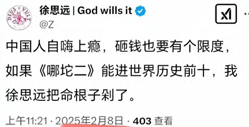 然而,一个月前,一位高校影视学教授徐思远曾出言不逊,嘲讽道:“如果《哪吒2》能进入全球前十,我愿把命根子剁了!”