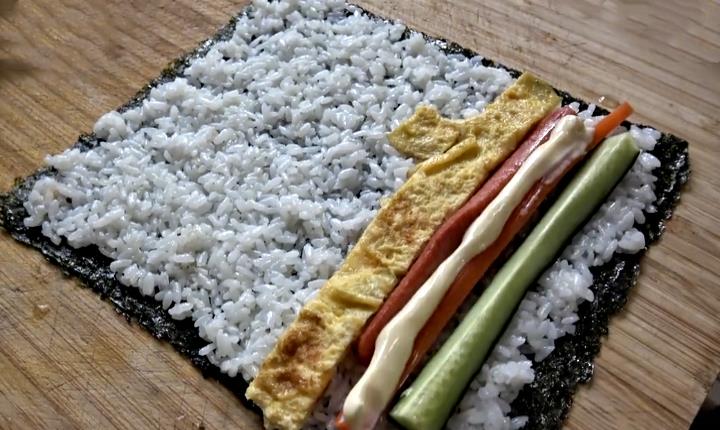 提前把大米和糯米蒸熟,在大米饭中加上一点糯米,再加上适量的寿司醋搅拌均匀。准备点海苔,把米饭均匀铺在上面,放上火腿肠、黄瓜、胡萝卜和鸡蛋,再挤上点沙拉酱,从一端往上卷起来,切成小段,就可以装盘开吃了。