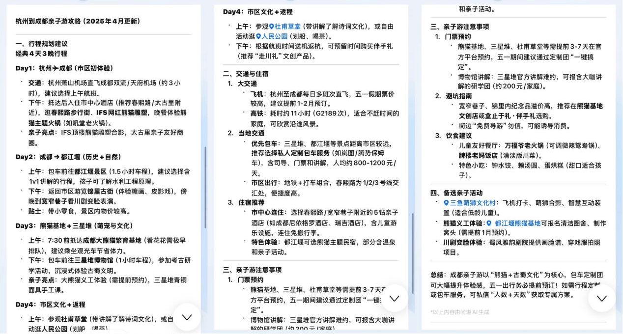 壹览商业拿“杭州到成都亲子游”这一问题,同时发送给包括“问一问”在内的三个旅行AI产品。