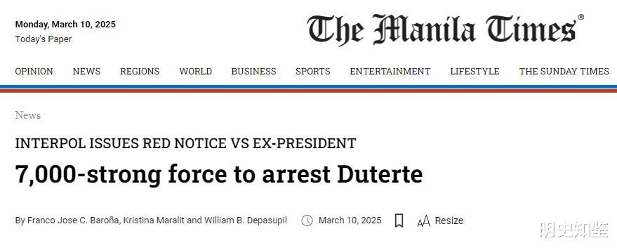 根据菲律宾本地媒体《马尼拉时报》的报道,此次抓捕行动,菲律宾方面至少出动了7000名警察,菲律宾国家安全部队几乎锁定了境内各主要入境点,包括机场与港口,目的就是确保杜特尔特刚落地,就被羁押。