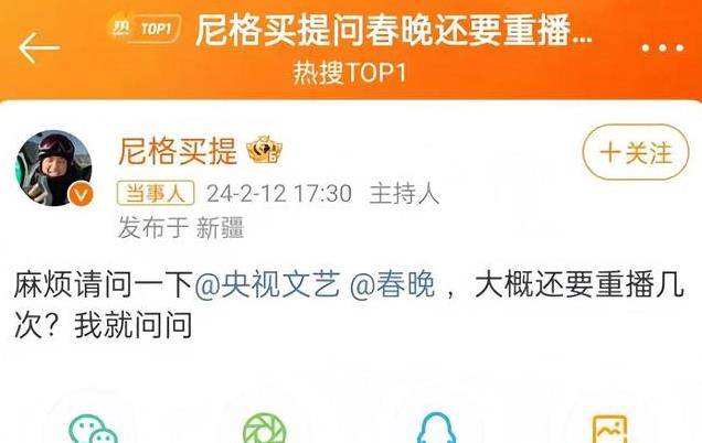 热搜爆了之后他也在微博上立刻回应,春晚会回播几次。