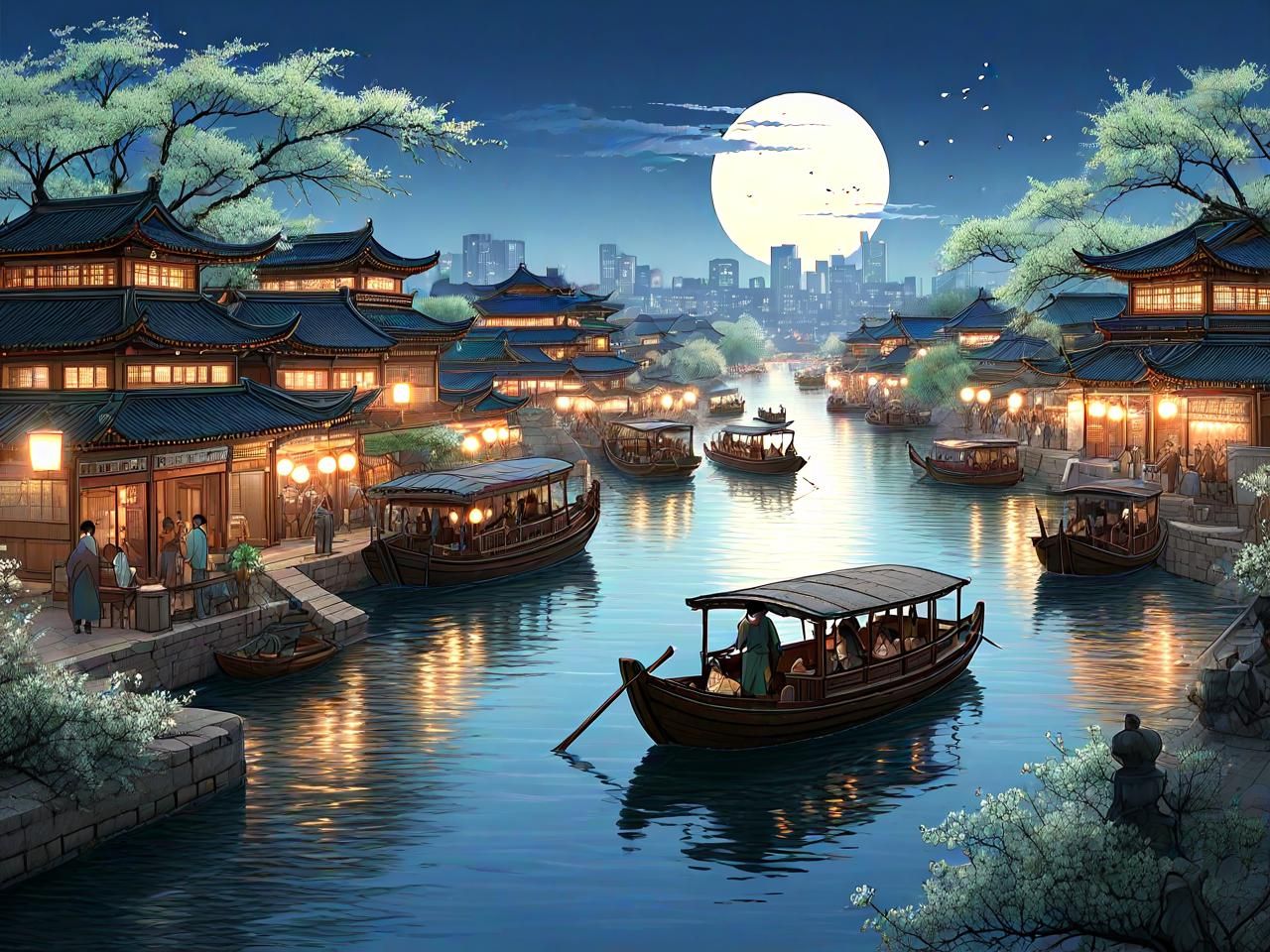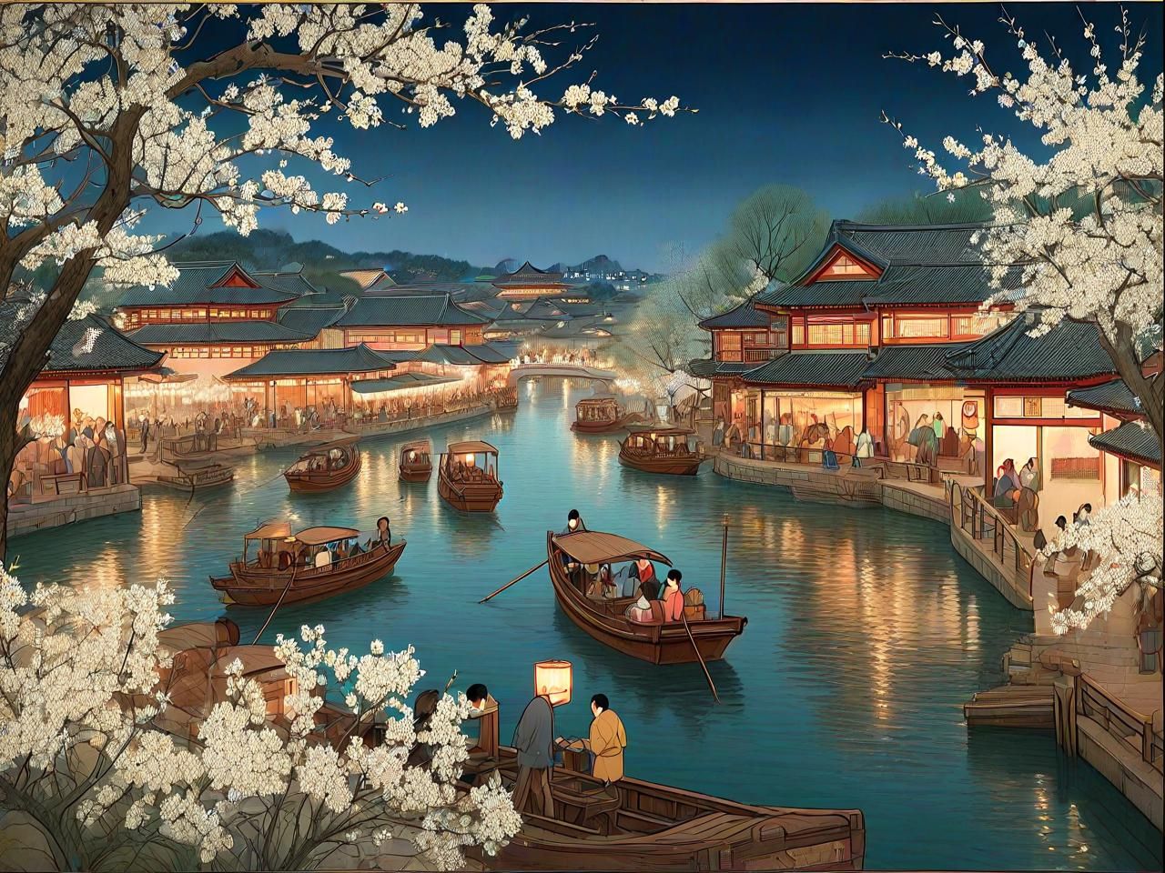 夜幕降临,汴河两岸灯火通明,船只往来穿梭,热闹非凡。小二黑决定带春花夜游汴河,感受这别样的都市夜景。他们租了一艘小船,泛舟河上。月光洒在河面上,波光粼粼,宛如银河落入人间。