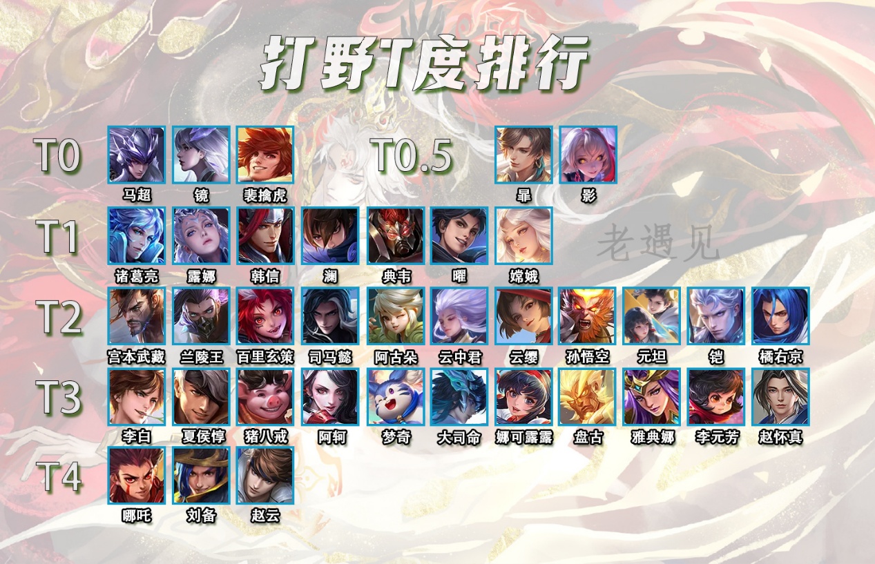 T1的英雄没有太大的变化,只是踢出去了一部分英雄,只保留了目前比较强势的,可以看到这些英雄不是法系打野就是刺客野,只有典韦还算是个例外,可以看出目前版本的野区环境。中间的英雄我们就不多聊了,主要聊一聊T4的这些英雄。