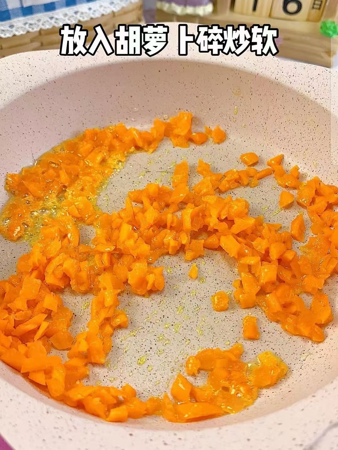 1.炒蔬菜碎:热锅倒入胡萝卜碎,快速翻炒胡萝至熟软。