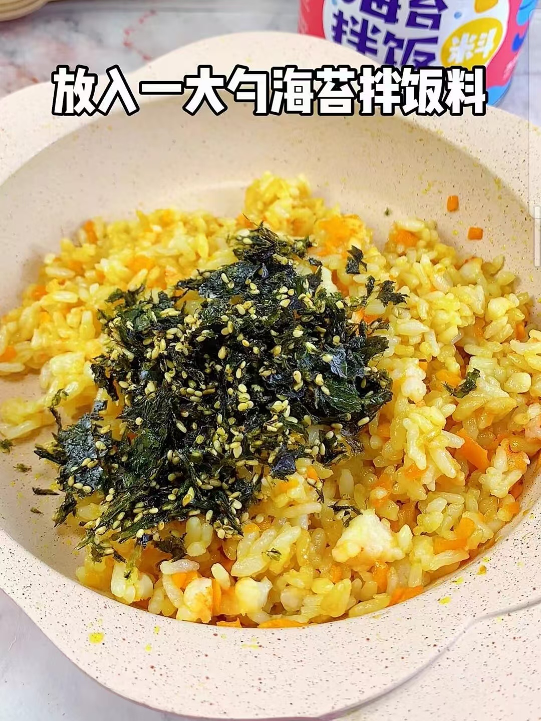 4.拌入海苔:将海苔拌饭料加入炒好的米饭,并滴入几滴核桃油。