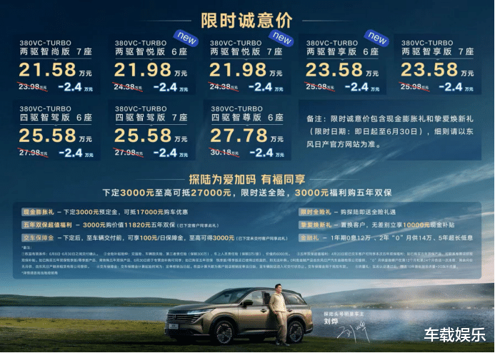 6月11日,“探陆的我们仨——发现大佛山见证新探陆”暨东风日产探陆两驱6座新级别上市直播活动在佛山举行。此次探陆共推出3款新级别车型,限时诚意价分别为:380VC-TURBO两驱智悦版7座21.98万元、380VC-TURBO两驱智悦版6座21.98万元、380VC-TURBO两驱智享版6座23.58万元,真正实现两驱四驱6座7座随心选。