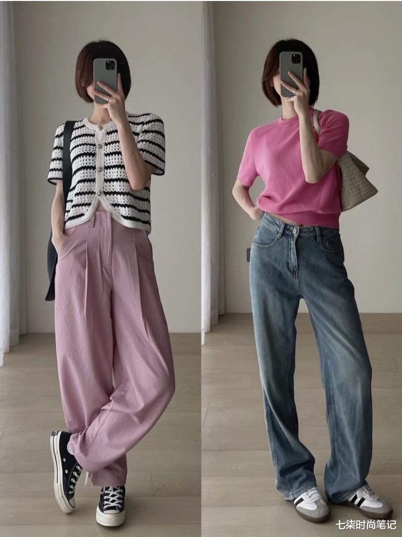 另外上短下长的穿法也能有效优化身材比例,小个子尤其适合这样穿。在夏天可以选择上半身穿亮色,不仅能将视觉重心上移,也让原本简单的穿搭多了一些层次感。