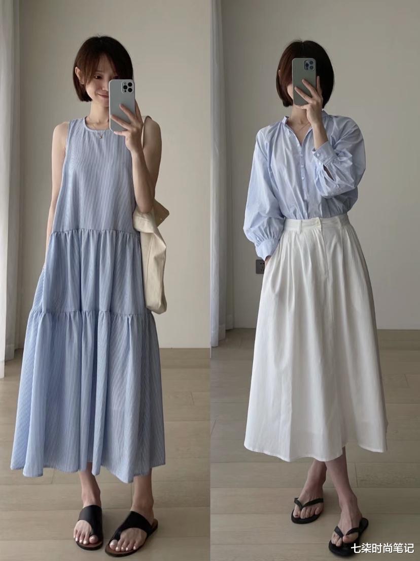 蓝+白,和夏天也是绝配,仿佛把蓝天白云穿在身上,能瞬间赶走阴郁,带来好心情。夏天可以选择一件浅蓝色长裙,清爽又治愈。上班族可以选择蓝色衬衫,搭配白色伞裙,优雅又正式,休闲通勤兼顾。