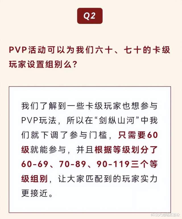 卡级玩家由于等级不够,很多游戏中的玩法都无法体验,而且怀旧服没有天外城战,这也导致卡级玩家pvp玩法也不算很多,然而,在游戏中,卡级玩家占了玩家群体的相当一部分,他们呼吁着可以得到更多pvp的机会。于是就在这两天的游戏公告中,预告了新版“剑纵山河”,宣布下调了门槛,让卡级组玩家也有机会参与,但是等大家仔细一看,70组的玩家立马就炸了。