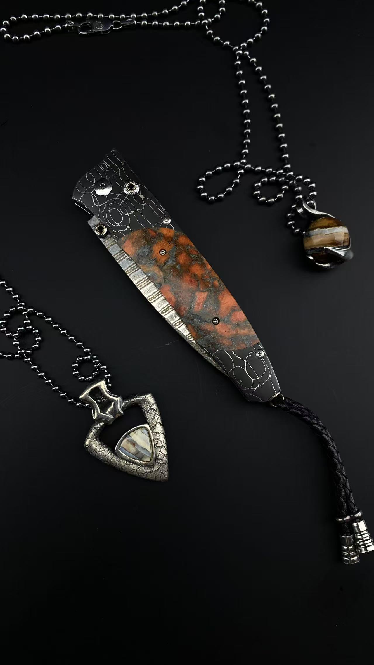 在一些关键的地方,像按钮锁的那个按钮上面,威廉·亨利也会镶进很值钱的黄水晶这类宝石。这些宝石不仅起到了装饰的作用,更提升了产品的整体质感与价值,让每一把刀具,都仿佛是,一件精美的艺术品,兼具着实用性与观赏性。
