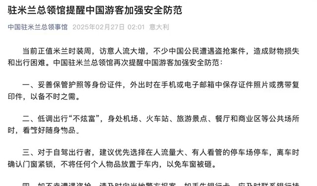甚至连中国驻米兰的大使馆也都关注到了这件事,大使馆官方发文提醒中国同胞出国在外一定要低调出行不炫富,注意自己的随身物品,以免被抢。