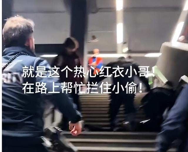 终于他们在再次锁定了嫌疑犯,眼瞅着抢劫犯即将从出口逃跑,这时一位热心的红衣小哥出手了,一下给抢劫犯绊倒在地上。