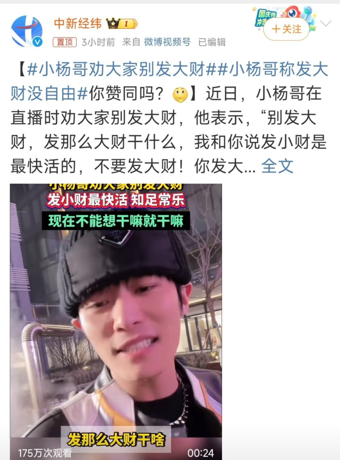 小杨哥说:“别发大财,发那么大财干什么,发小财是最快活的,发大财了就要想这个财怎么样才能长久⋯我现在要是去买个轮船的话又舆论了,我能买吗?我不能买!我啥都不能干,我以前还喜欢去酒吧蹦迪,我现在能去吗?一去又被别人说”