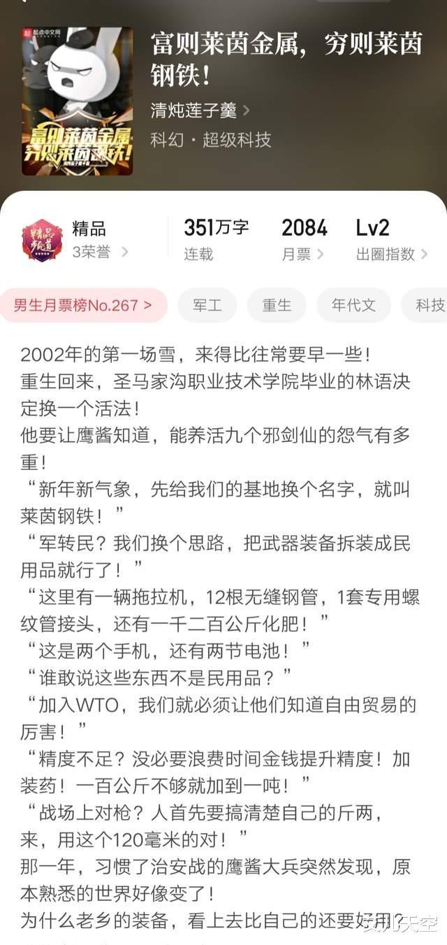 话说“莱茵金属,莱阳钢铁”也是很有名的军工梗了,作者以这个梗来作为小说的切入点,本身也很容易吸引读者的。