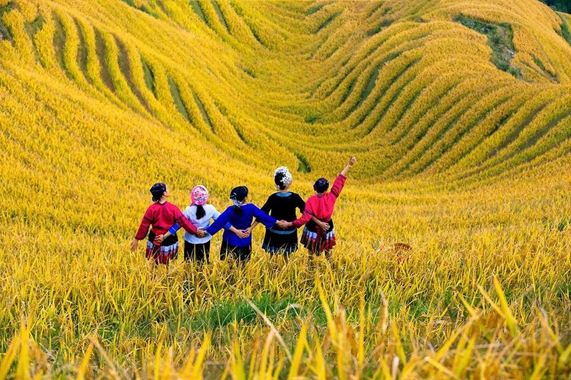 当秋冬的脚步悄然来临,龙脊梯田又换上了一身别样的盛装,展现出独特的韵味。秋意渐浓之时,梯田里的稻谷逐渐成熟,那原本翠绿的稻穗开始染上金黄的色彩,仿佛是大自然用金色的颜料为大地涂抹上了一层绚丽的色彩。微风拂过,稻浪翻滚,此起彼伏,像是一片金色的海洋在山间涌动,发出沙沙的声响,仿佛是大地奏响的丰收乐章。阳光洒在稻田上,每一粒饱满的稻谷都闪烁着金色的光芒,与周围山峦的翠绿、天空的湛蓝相互映衬,构成了一幅色彩斑斓的绝美画卷。此时漫步在梯田之间的小径上,脚下是松软的泥土,身旁是沉甸甸的稻穗,鼻尖萦绕着稻谷的清香,耳畔传来阵阵欢声笑语,那是农民们在田间收割的喜悦之声,让人深切地感受到丰收的喜悦和农耕生活的质朴与美好。