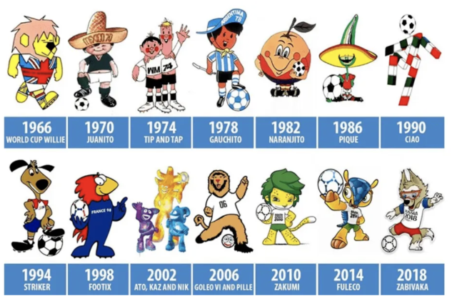 世界杯吉祥物的发展历史可以追溯到56年前的英格兰世界杯。首个世界杯吉祥物名叫“威利”。英格兰队也被称为“三狮军团”,这一届的吉祥物就以狮子为原型,发型与着装也借鉴了当时流行的款式。