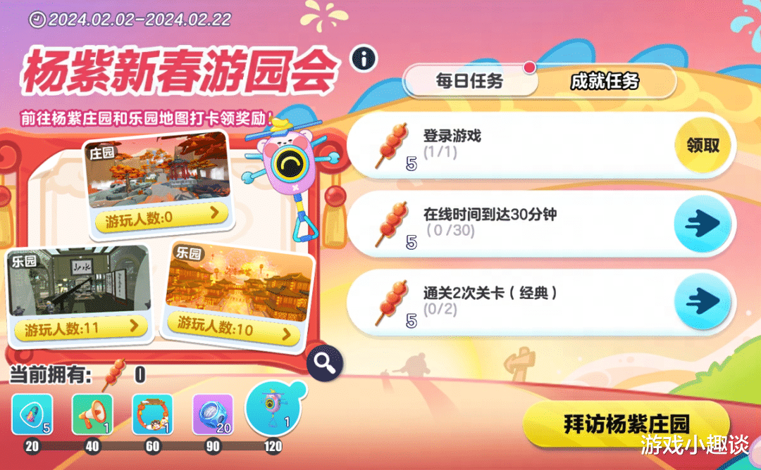 2月2日到15日期间,【与紫游园】活动盛大开启,这个新年就和【杨小紫】一起去新春乐园游!完成任务拿到【糖葫芦】,用你的【糖葫芦】去兑换杨紫烟花、头像框【白雪红梅】以及【呦呦-小猴紫】吧!