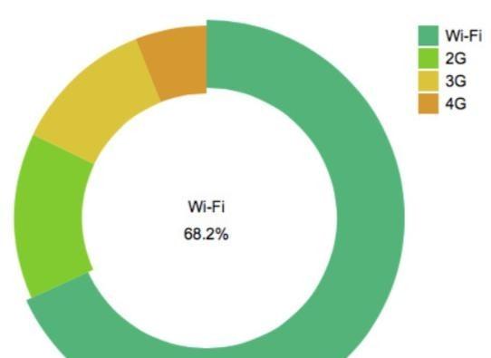 终端wifi使用情况:真实的用户通常会使用wifi来下载和启动App参加网络课程。因此,如果wifi下面使用App的情况少于80%,则刷量的虚假用户数据风险较大。而对于普通App(所需流量较少),wifi下面的使用率在60%-70%之间。下图是普通App在正常情况下wifi和数据漫游服务使用的比率。