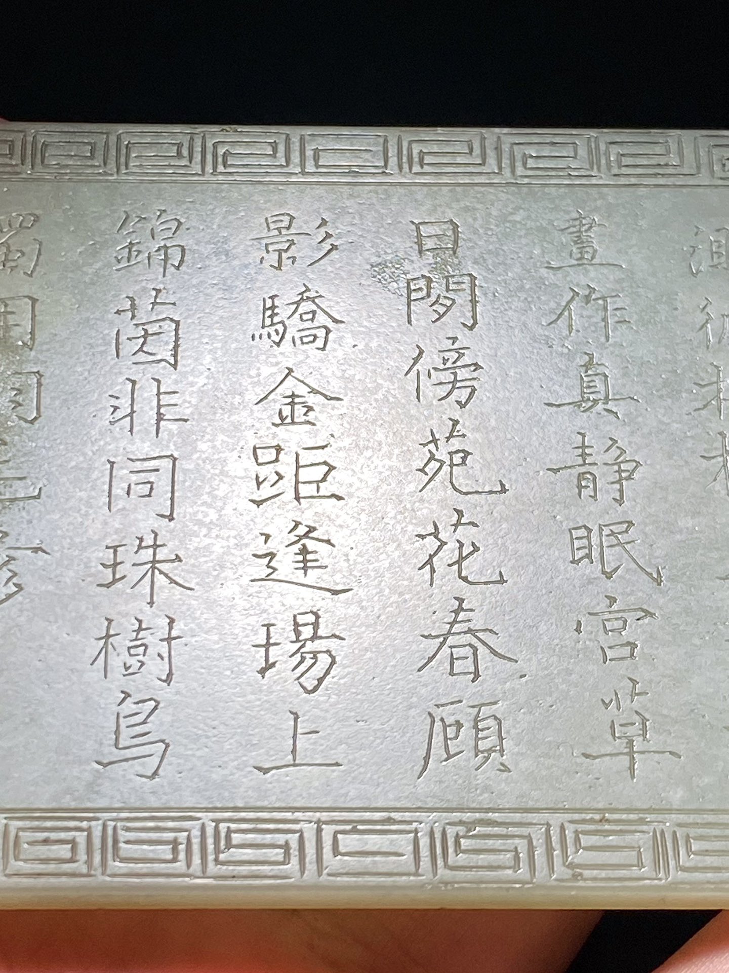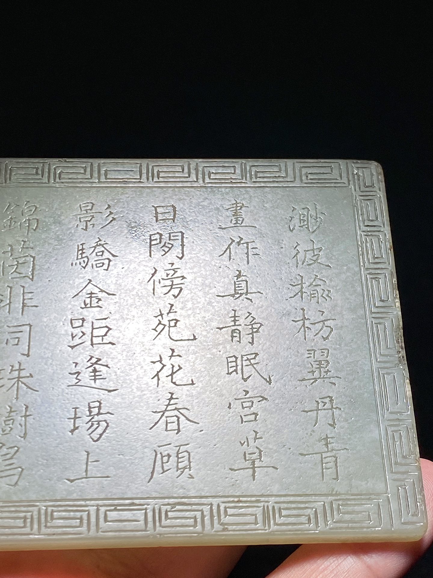 清乾隆 和田玉籽料 青白玉 岁岁平安 诗文 插屏 玉板 宽12厘米 高8厘米 厚0.6厘米 重143.5克 玉牌以和田籽料为材,玉色青白,用料颇大,质地细润,光透亮泽。正面浮雕岁岁平安纹,鹌鹑一对,在山石间垂有一簇麦穗儿,鹌鹑栖于穗下,取「穗」、「鹌」谐音,意喻「岁岁平安」,以流畅的线条既勾勒出美好的图景,又将作品吉祥的寓意表达得淋漓尽致。背面阴刻诗文“渺彼榆枋翼,丹青画作真。静眠宫草日,閒傍苑花春。顾影骄金距,逢场上锦茵。非同珠树鸟,独用羽毛珍,”落“董邦达”敬书款。此件玉板尺寸适中,可配座陈设,亦可置于案头清赏,实为怡情雅趣佳作,雕工精细,赋有诗文,图文相映,深合我国传统文化的人文内核。